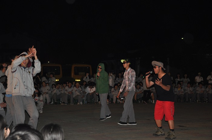 天色渐暗,广场上亮起了照明灯,篝火点起来了,晚会上演了!歌舞飞扬、吹拉弹唱,好不热闹!表演者全情投入,观众群互动积极,激情燃烧,亲密无间。八班曹隽的B-box秀,九班自创的农村甄嬛传,十一班的歌舞,十班的器乐书法《青花瓷》等等都给人留下深刻印象。最后,2班陶柏叡的一首《十年》带动全场合唱,李云辉老师代表班主任演唱了《牡丹之歌》。在晚会尾声时,基地上空跃起了璀璨的烟花,伴着地面升腾的篝火,在同学们热烈的欢呼声中,如绽放的青春,格外绚丽夺目!