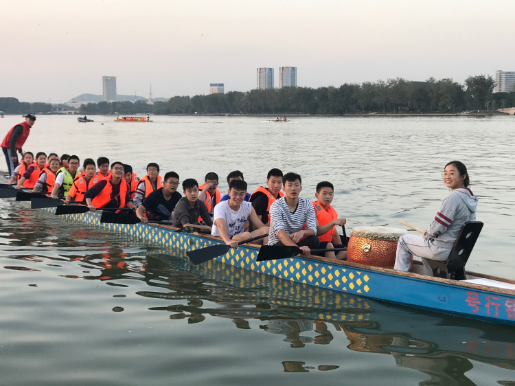 南京市中小学生龙舟比赛普高组的规模是二十二人混合组。比赛分为两项,两百米冲刺划和五百米耐力划。针对龙舟比赛,体育组王翔和孙彬彬老师早早做好了队员选拔工作;学校也非常重视,不仅购买了碳纤维浆,也为我们的训练提供了后勤保障。在体育老师的指导下,我们利用大课间进行了专业的体能训练,并且每周一、二、四的第八节课后去玄武湖水上训练。基本上训练结束回来,晚自习已经开始半个小时。虽然时间紧,但是大家会更加珍惜时间,提高效率,丝毫没有影响到成绩;每次训练结束时,大家衣服都湿了一大半,秋风一吹,其滋味可想而知。半个月下来,我们已从一开始连浆都不会握到动作标准,也从2个人划齐到最终22人频率如一。此刻,我们才真正明白了什么叫团队合作!