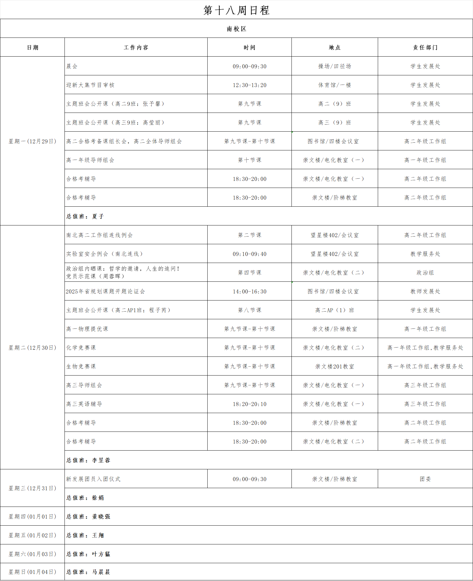 第十八周工作日程(12月29日-1月4日)