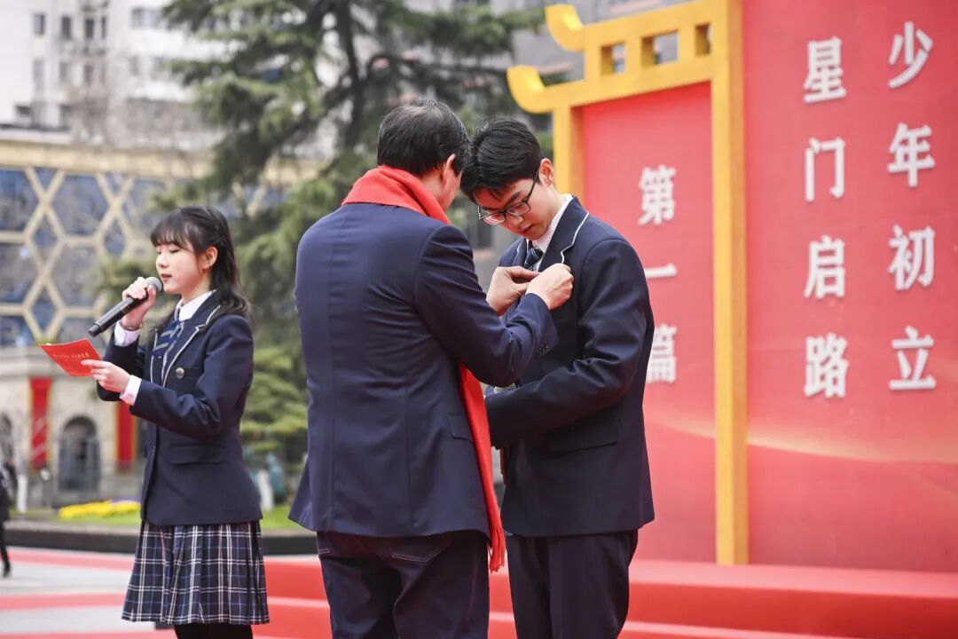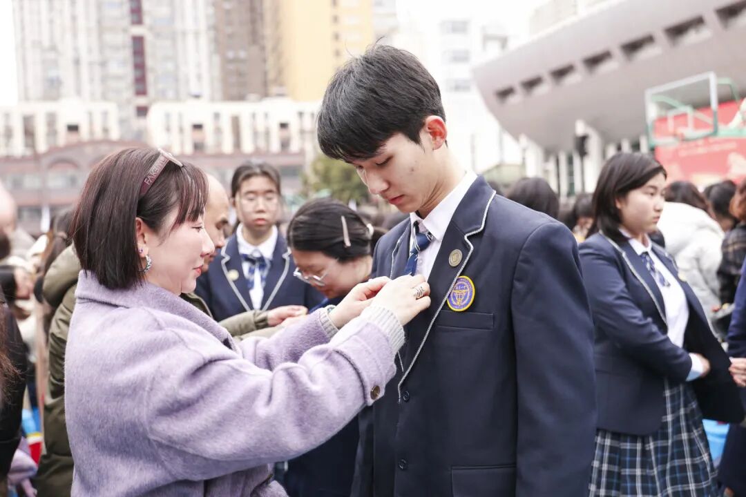 陈立其校长为学生代表佩戴成人徽章,家长们亲手为孩子佩戴成人徽章,指尖传递的是期盼,徽章承载的是成长。