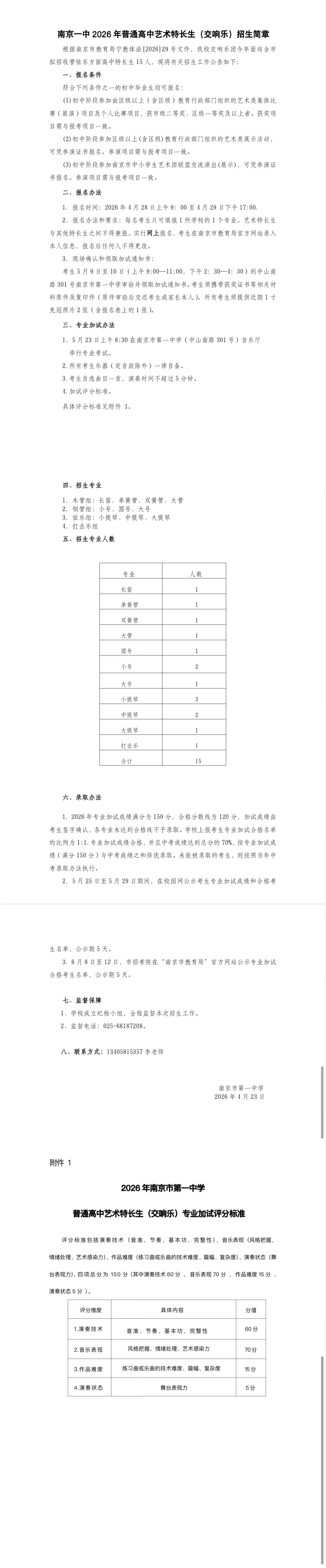 南京一中2026年普通高中艺术特长生(交响乐)招生简章
