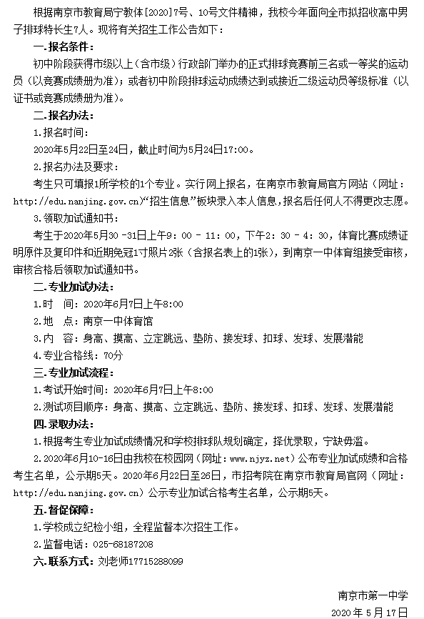 2020年南京市第一中学男子排球队招生简章